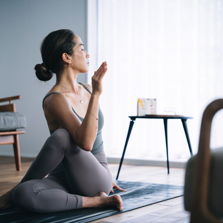 坐骨を立てて座ったら、鼻からゆっくり呼吸をしましょう。肩の力や顔のこわばり、歯の食いしばりも解きほぐして、リラックス。手を組んで前やななめに伸びをしたり、腰をひねったり、心地よいと感じる動きを自由に。